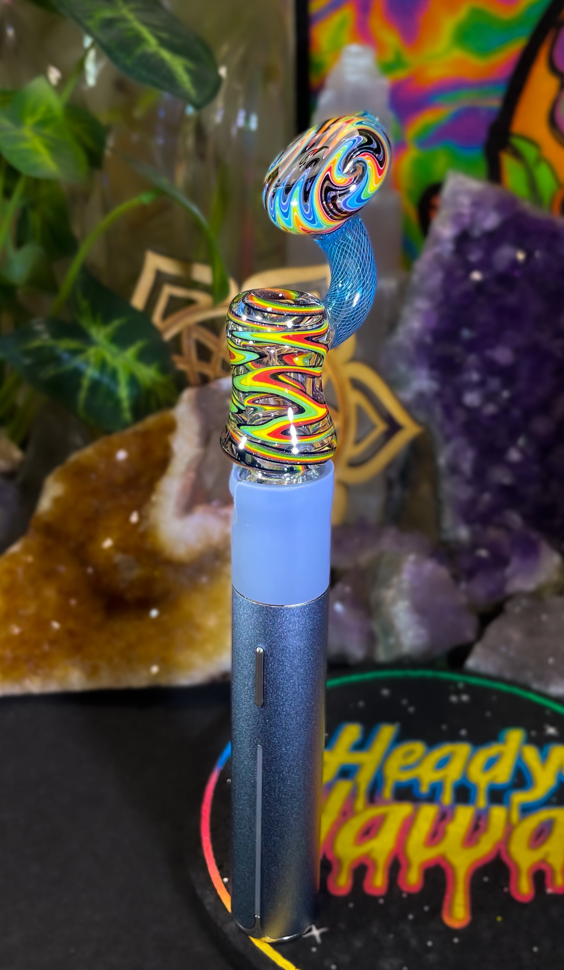 This is a miniature mock "bubbler" dry tip for the Puffco Pivot. Made with rainbow and rasta wigwags.