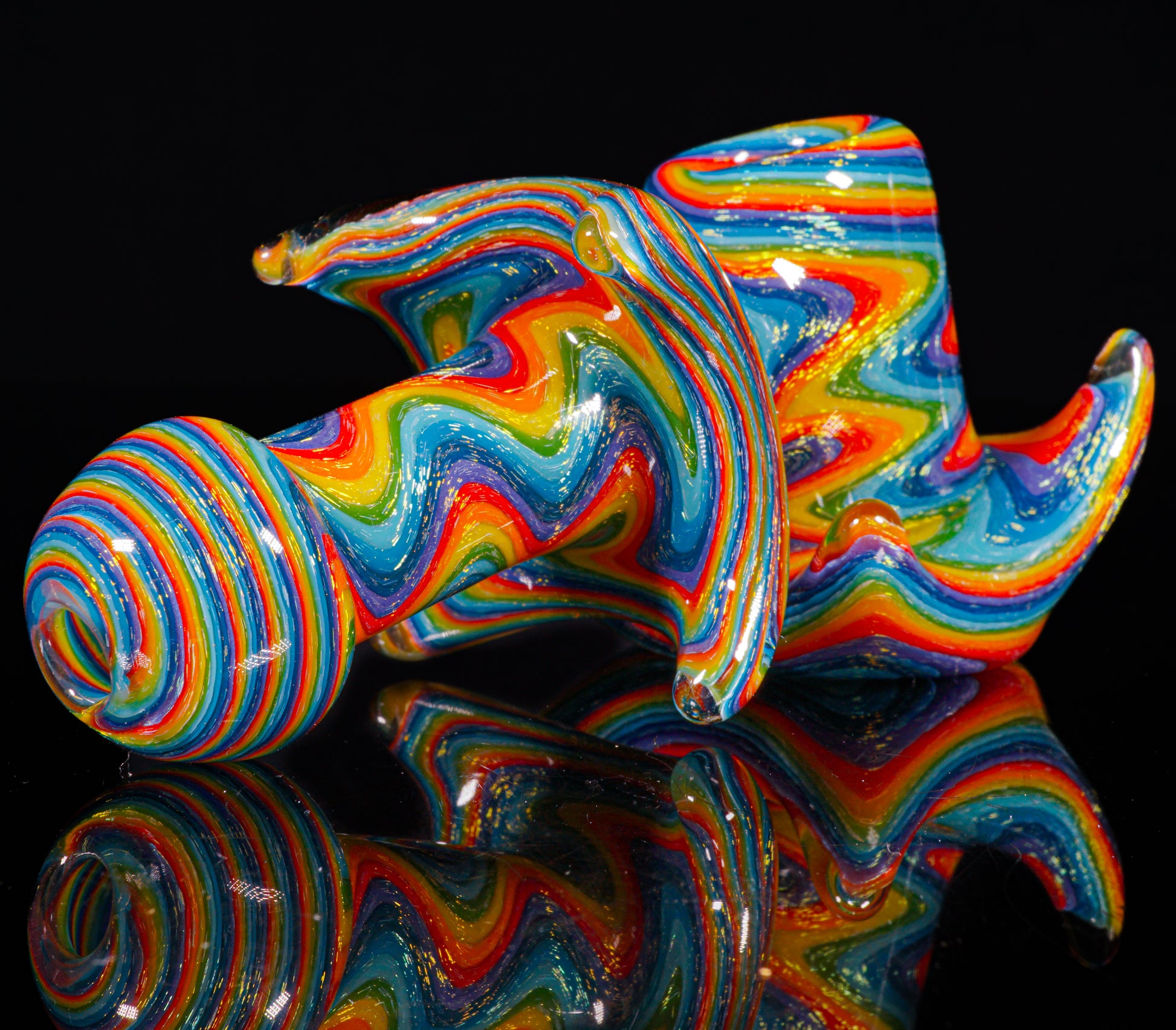 Stunning blue dichro coated rainbow wigwags cover every inch on this old school style hammer dry pipe.