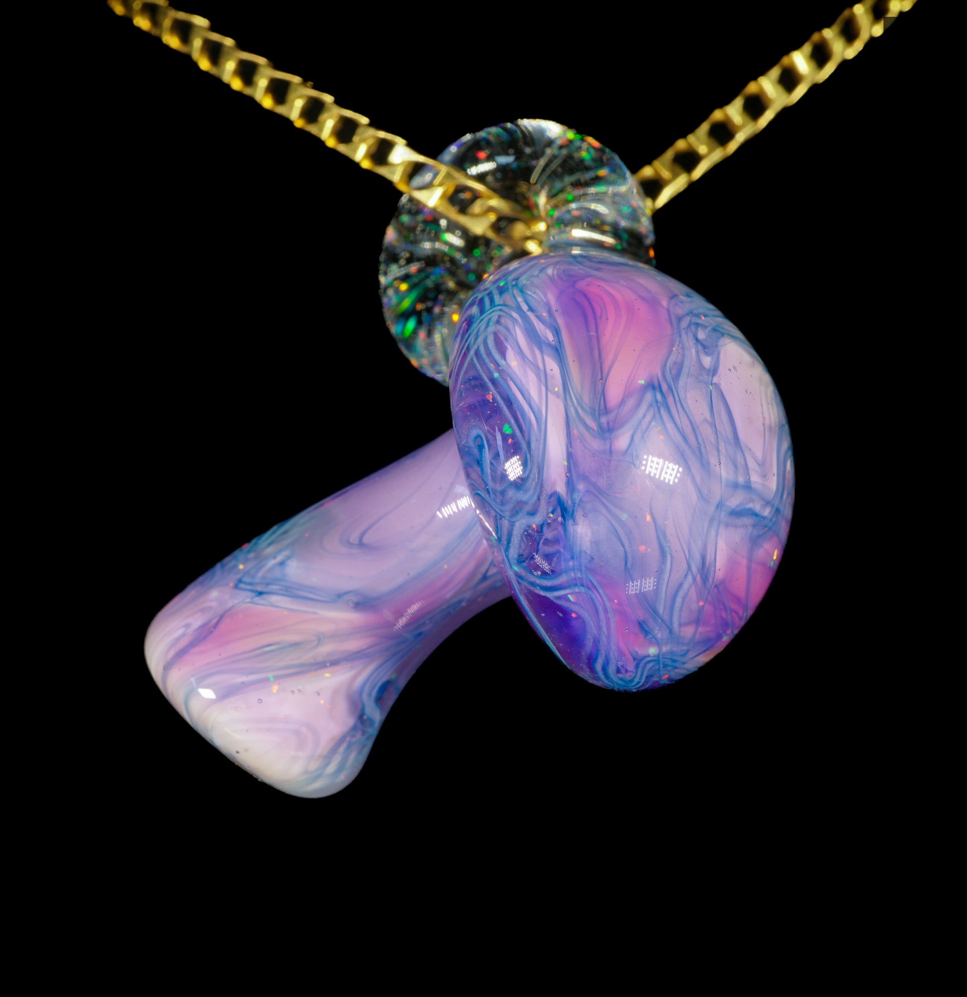 Solid glass mushroom pendant made with pastel purple and pink hues with uv-reactive blue scribbles throughout and coated in crushed opal.