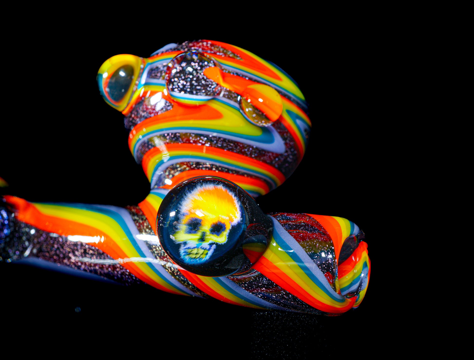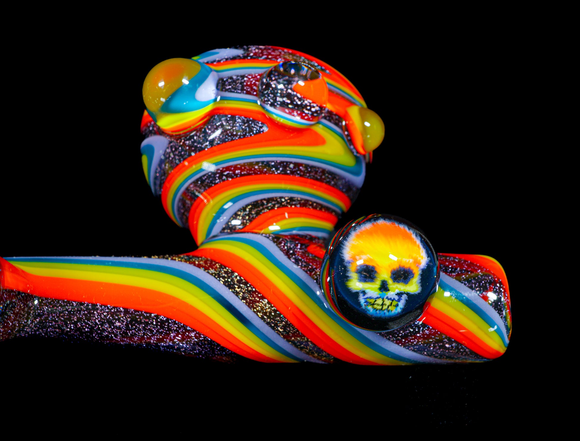 Stunning peace pipe style made with rainbow linework and gold and purple dichro.