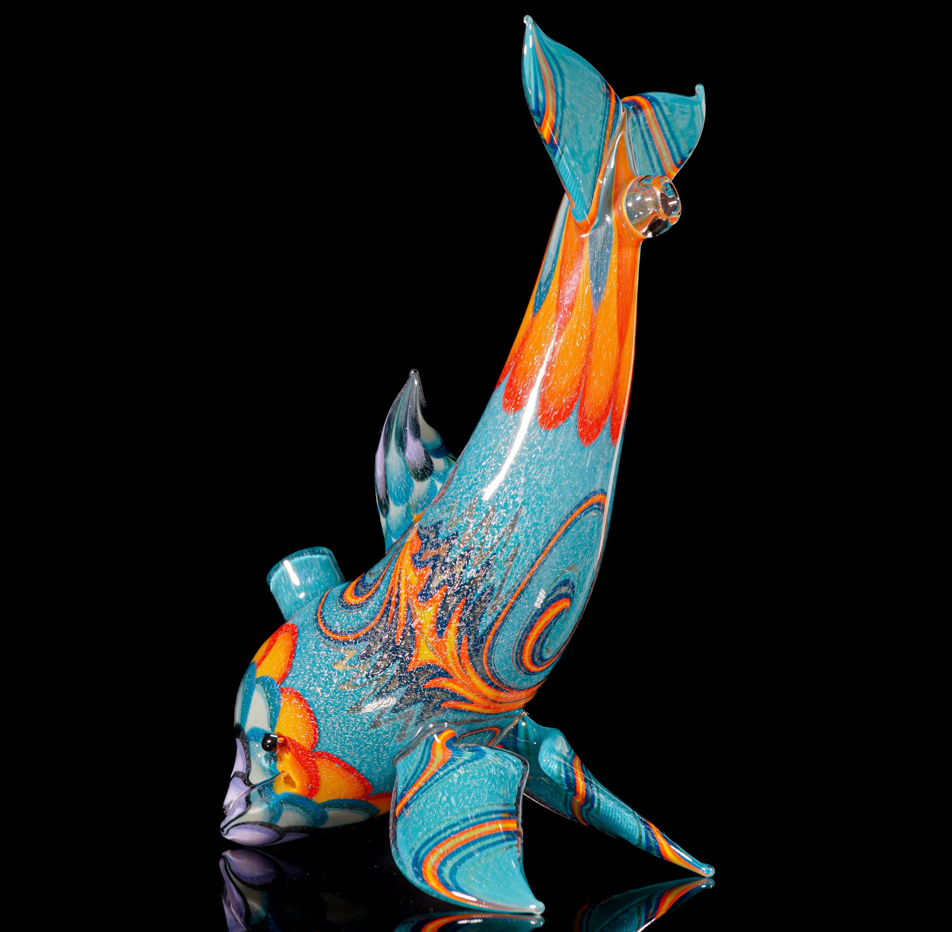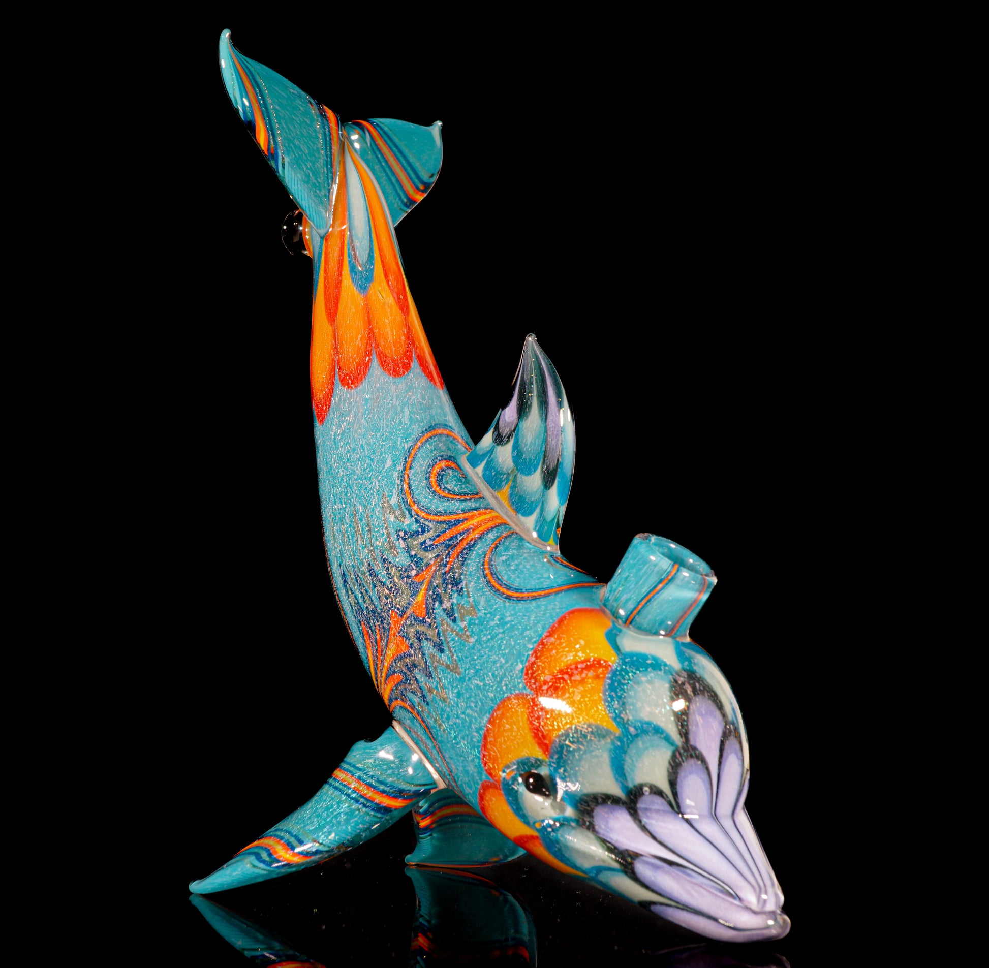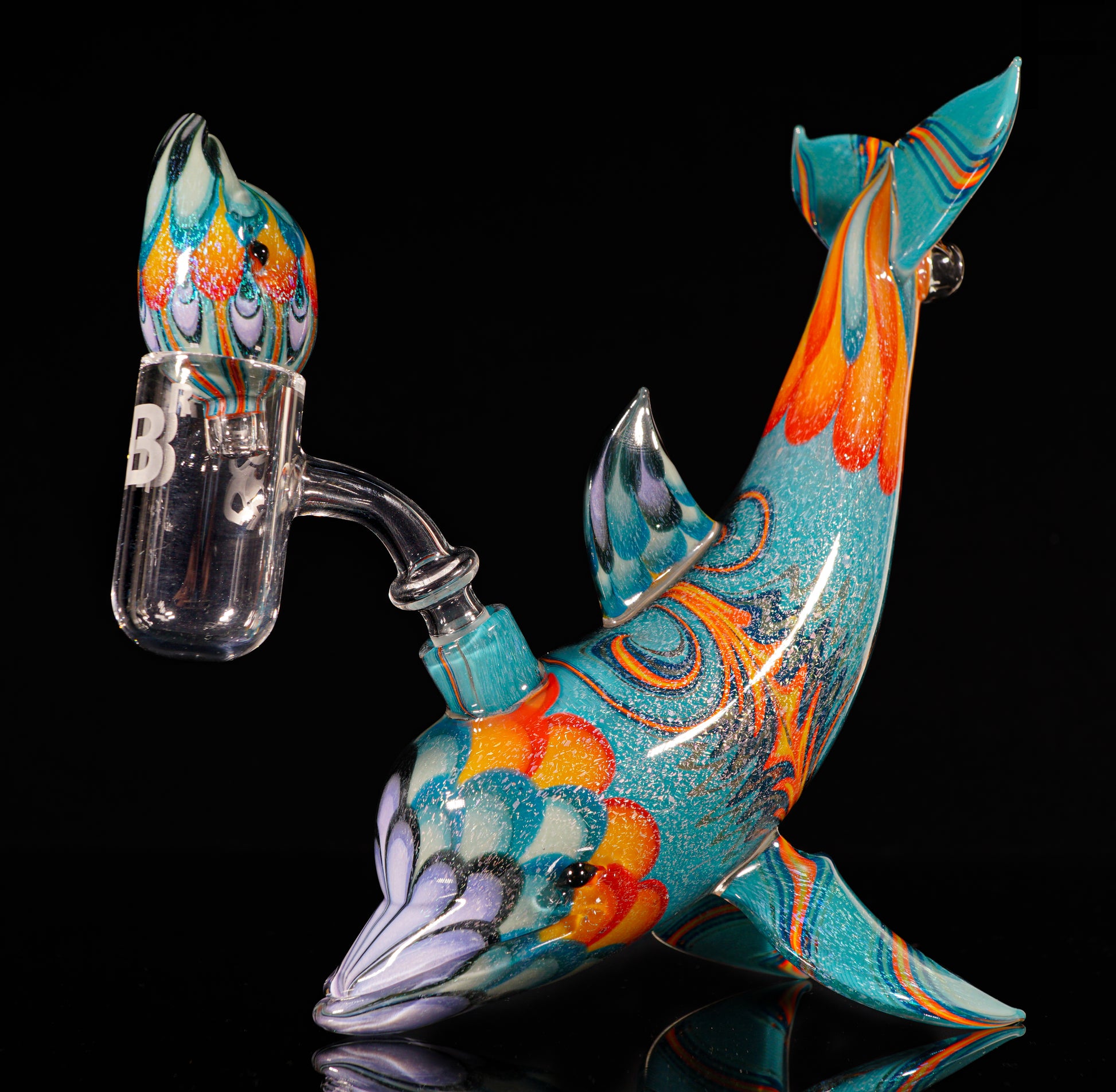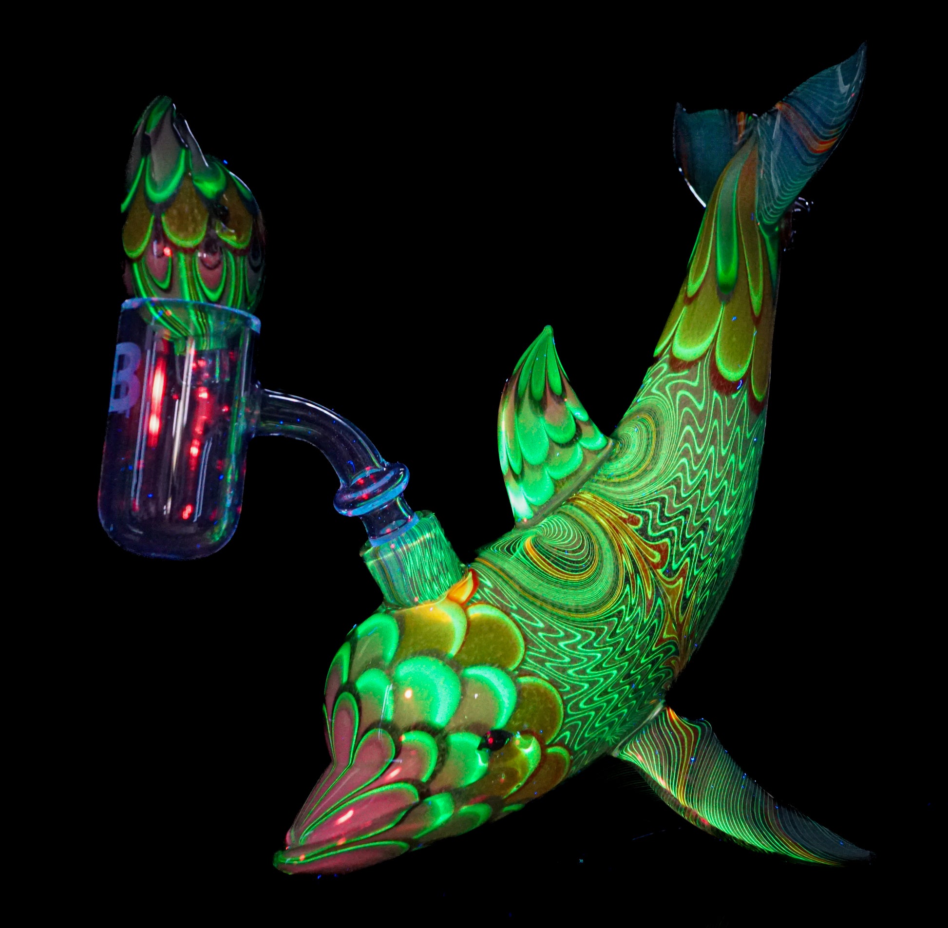 Incredibly detailed and realistic dolphin rig shaped by Chadd Lacy and made with WYG's uv-reactive fire and ice dot stack and wigwag, coated in turquoise dichro.