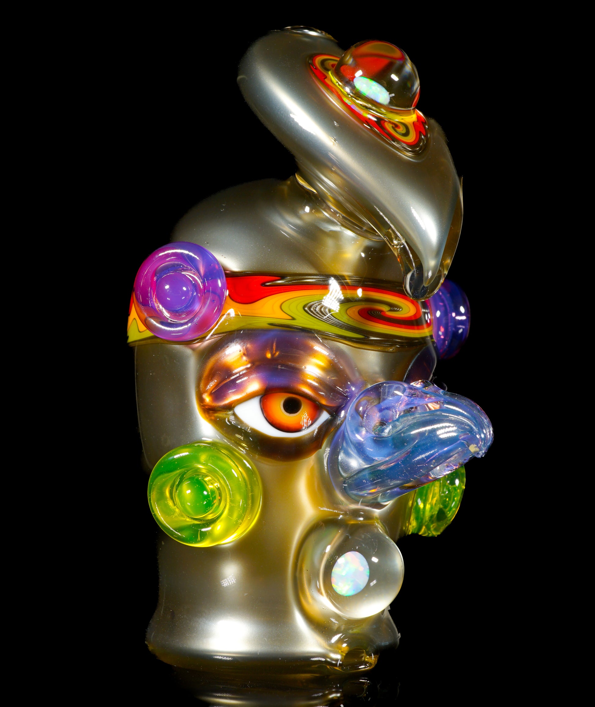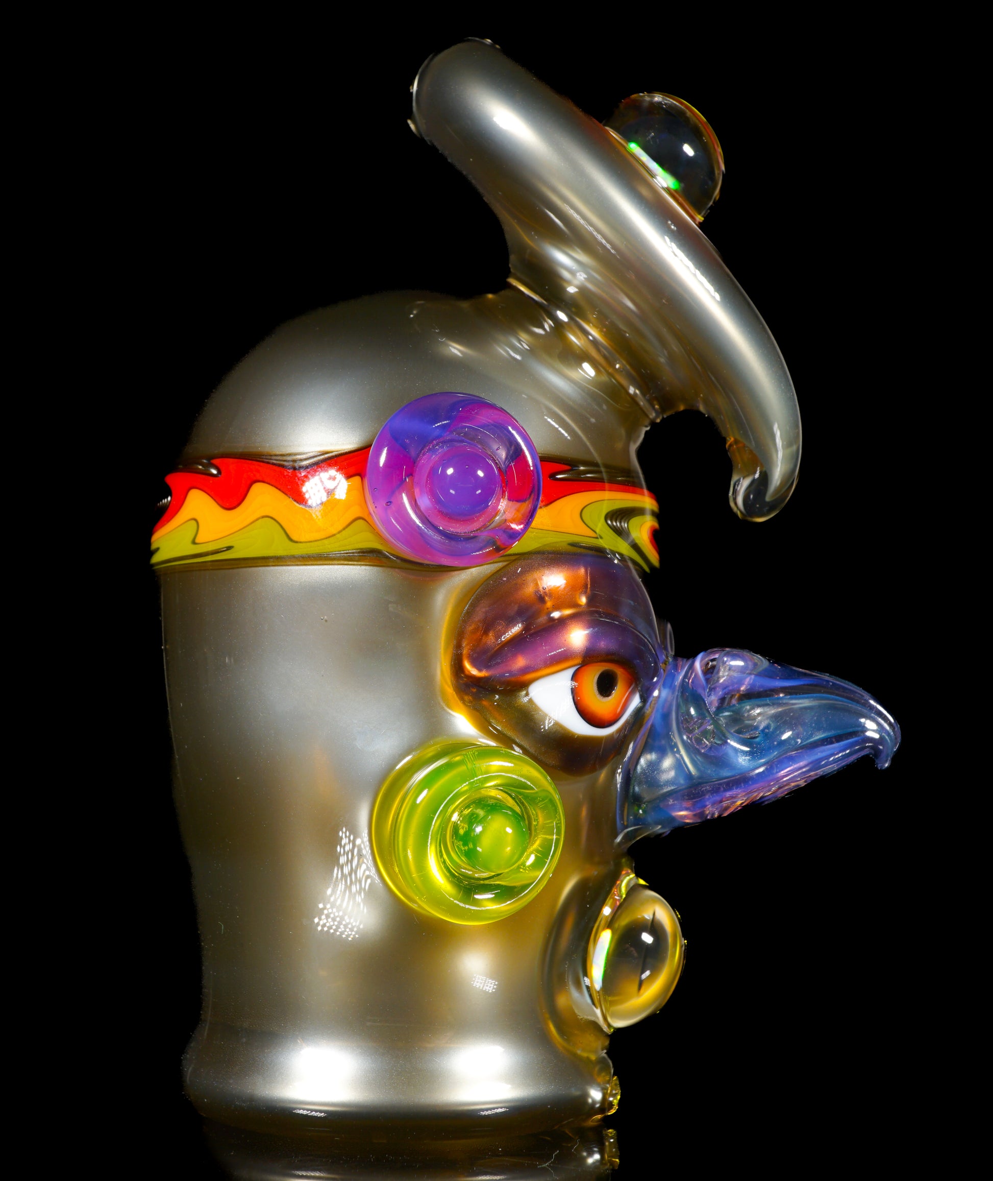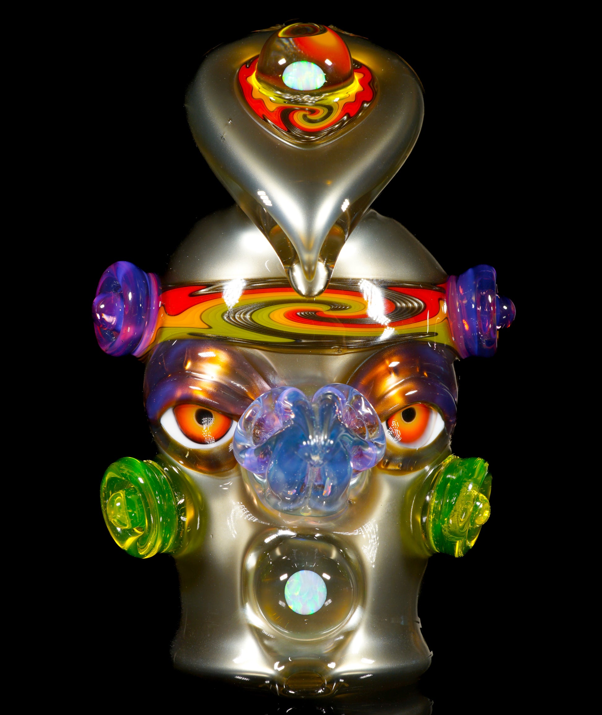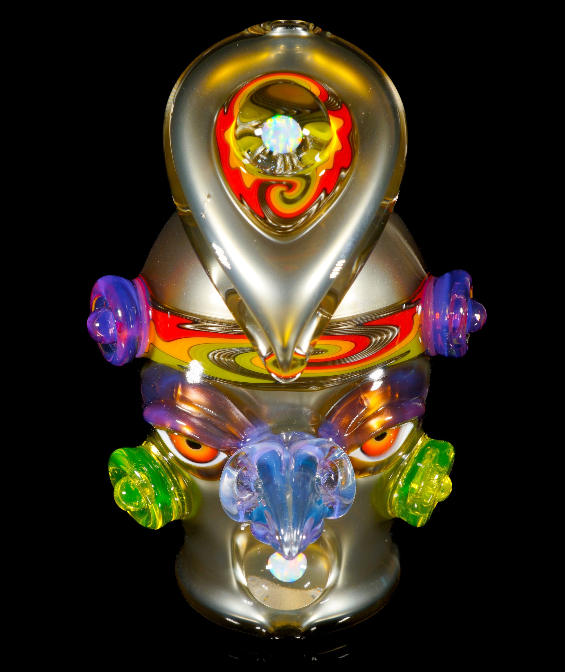 This electrum bird-head Peak top blends liquid-metal Electrum tones with a vibrant UV-reactive headband, wigwags on the third eye feather, and cheek accents. Opals shimmer subtly through the form, while the sculpted face gives it undeniable character