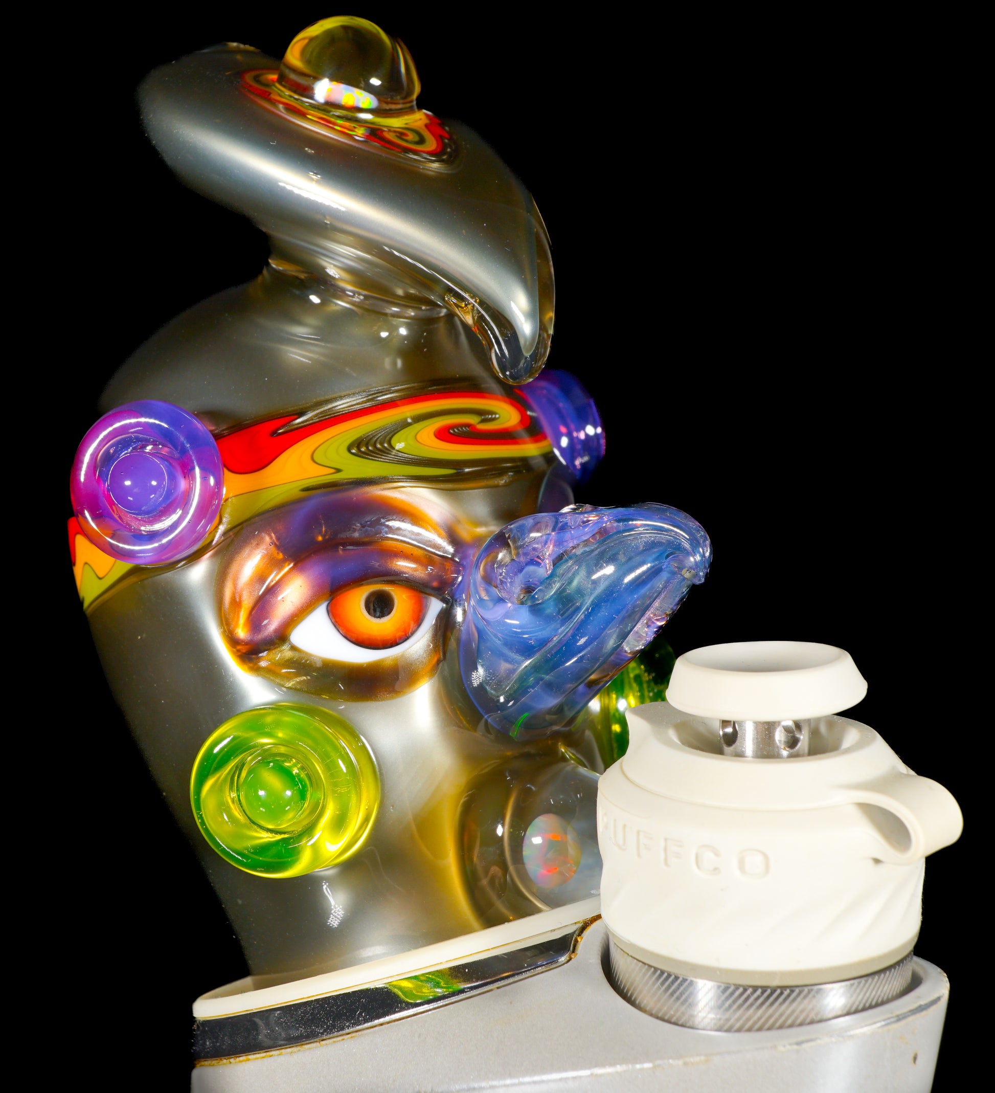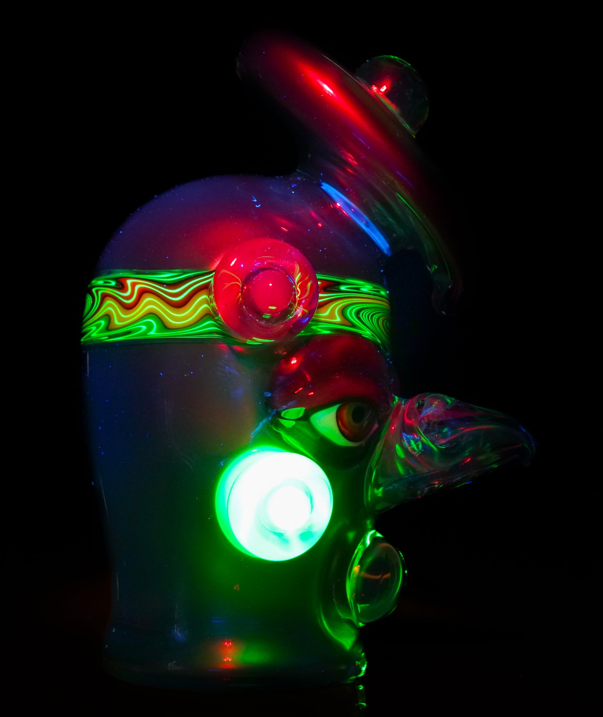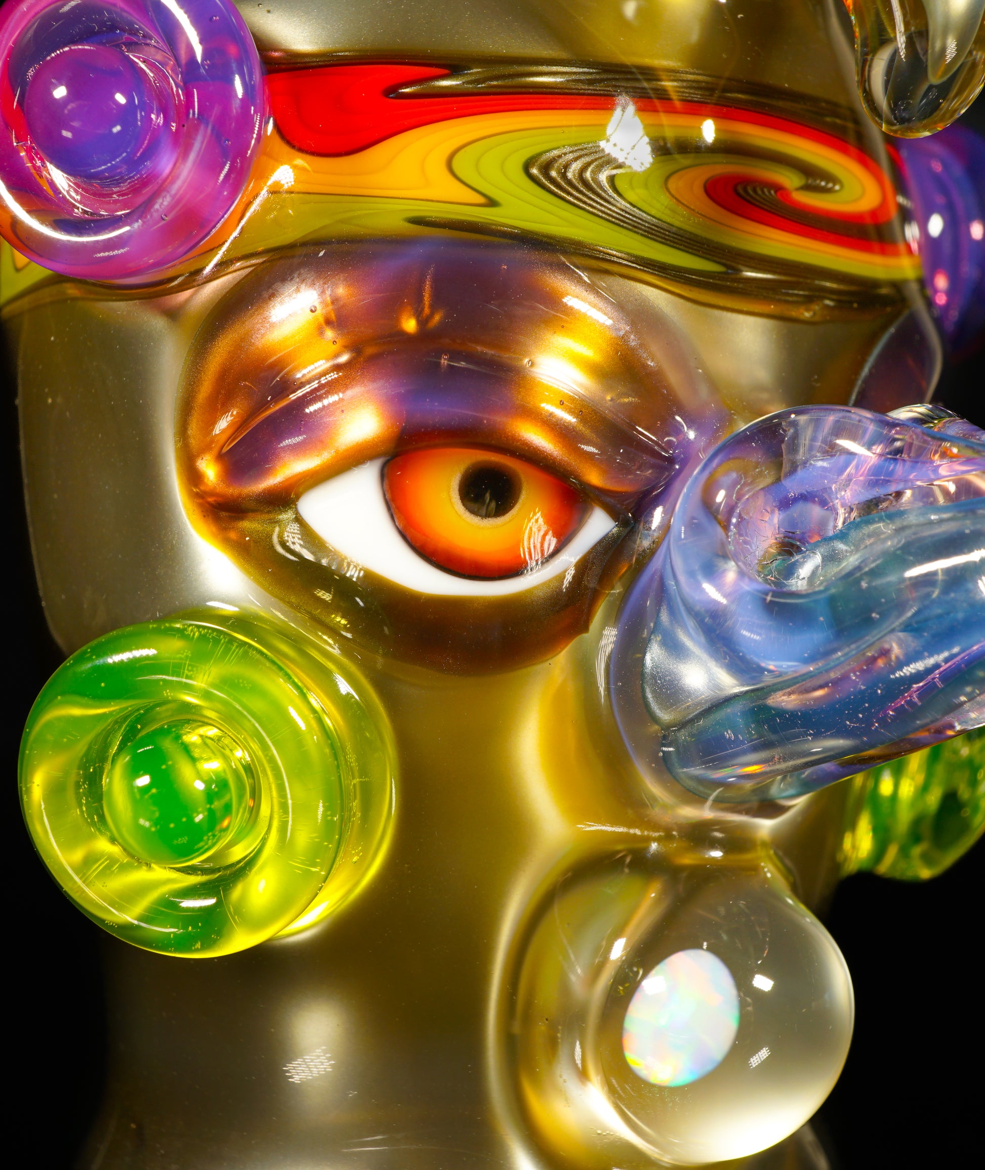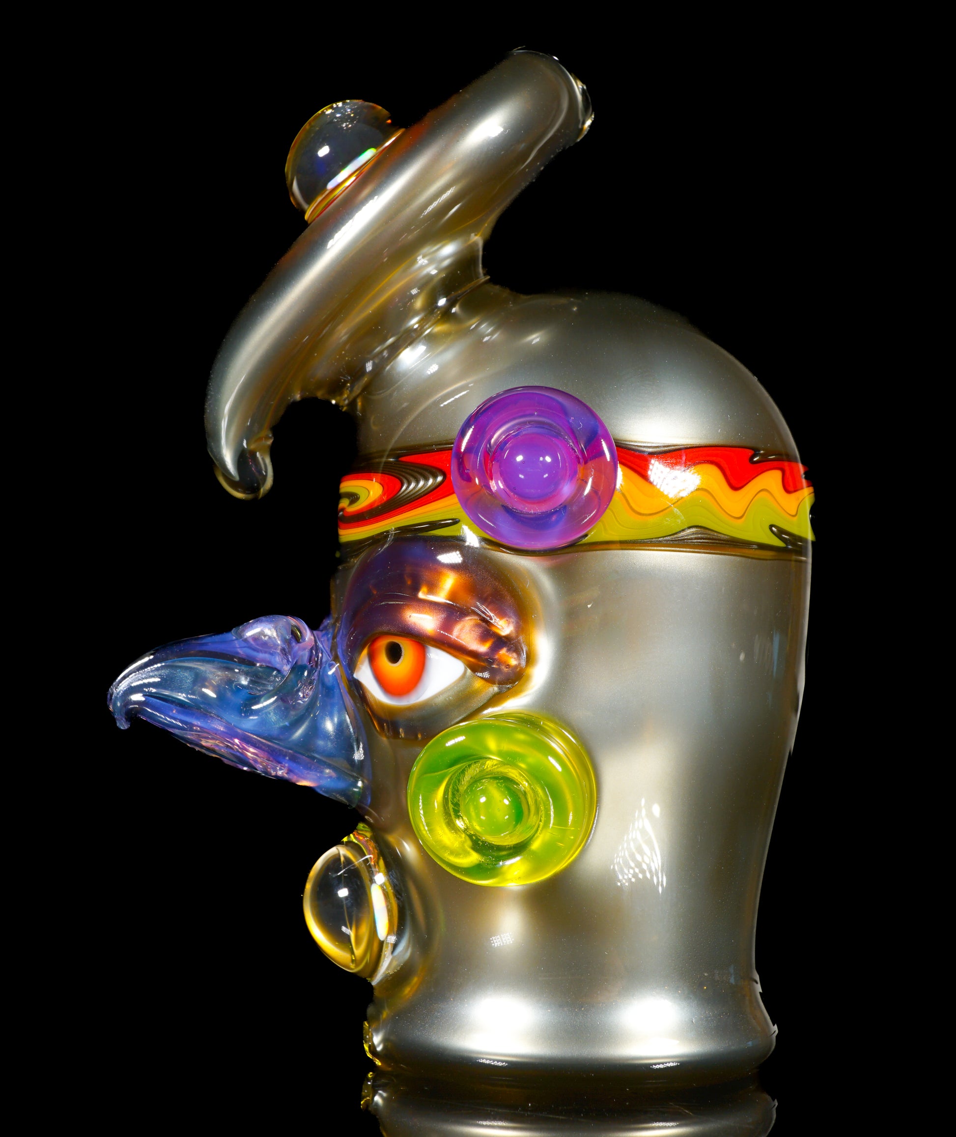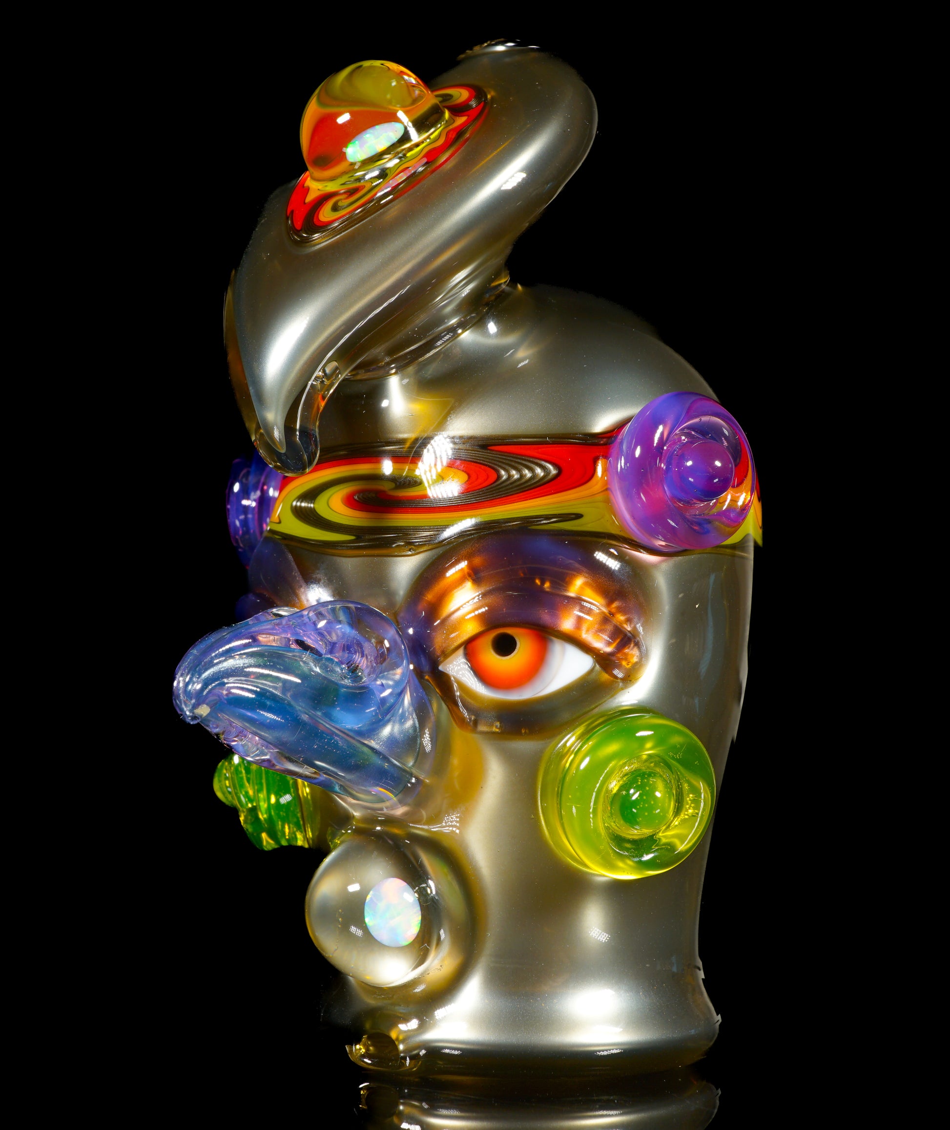 This electrum bird-head Peak top blends liquid-metal Electrum tones with a vibrant UV-reactive headband, wigwags on the third eye feather, and cheek accents. Opals shimmer subtly through the form, while the sculpted face gives it undeniable character