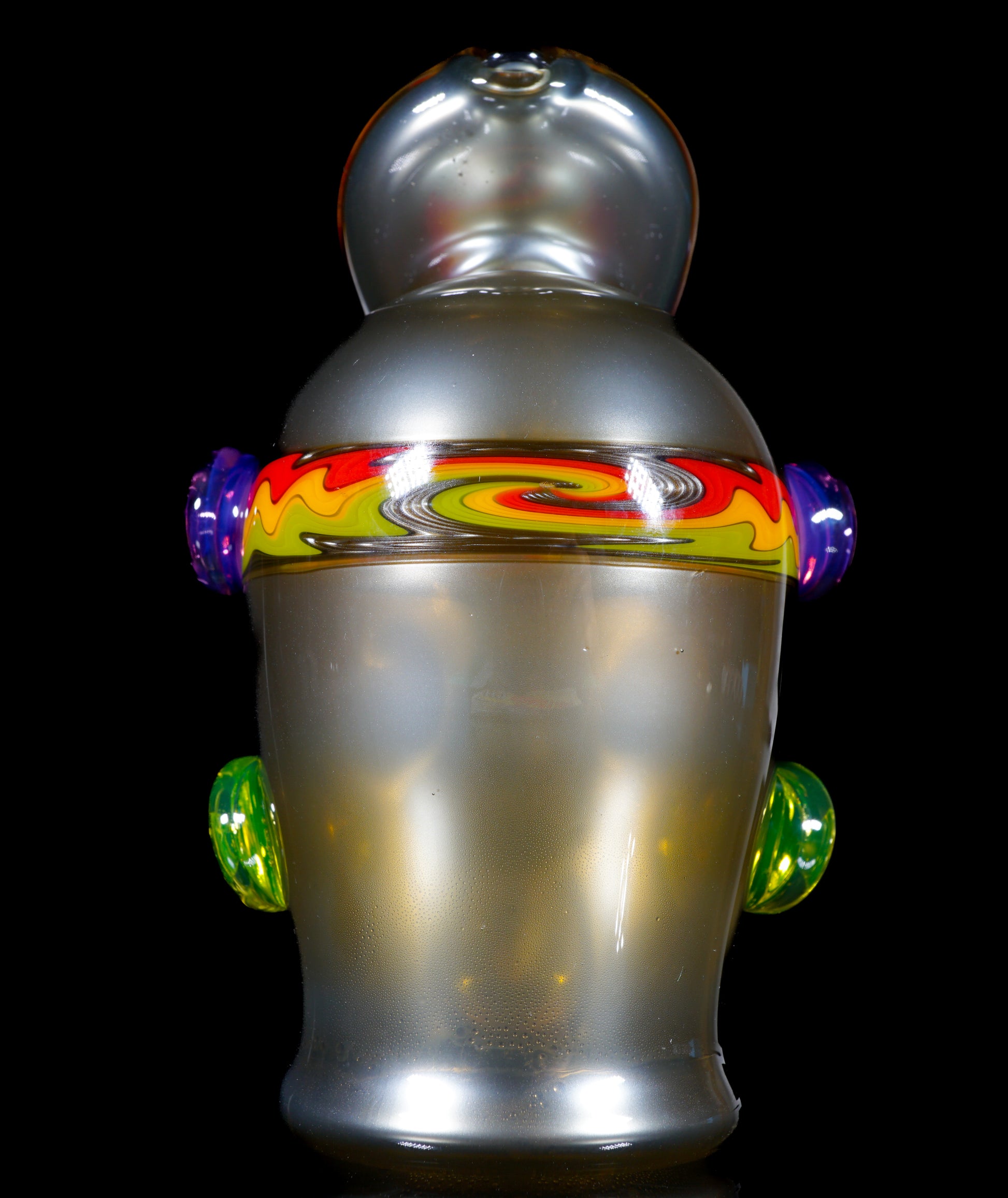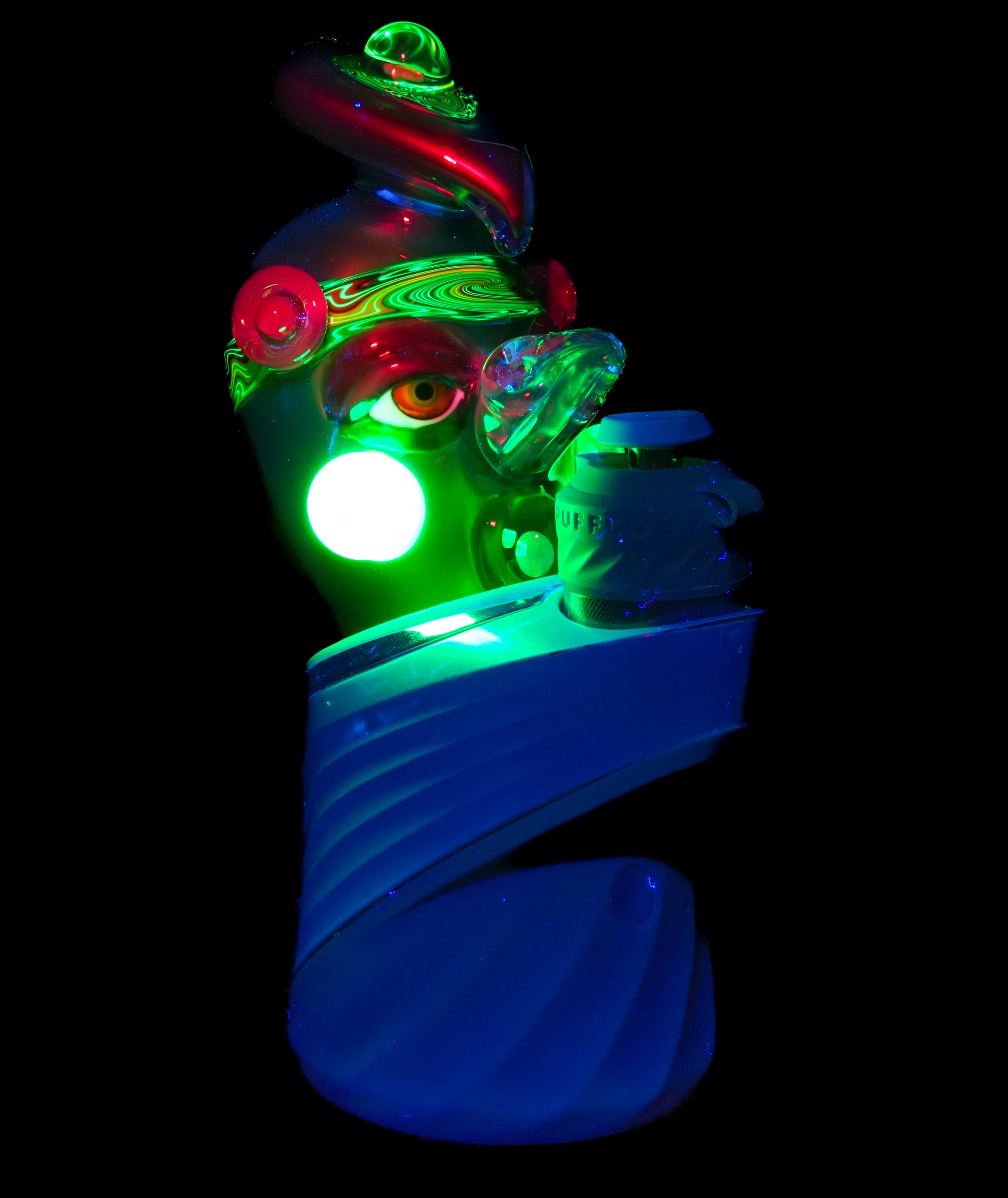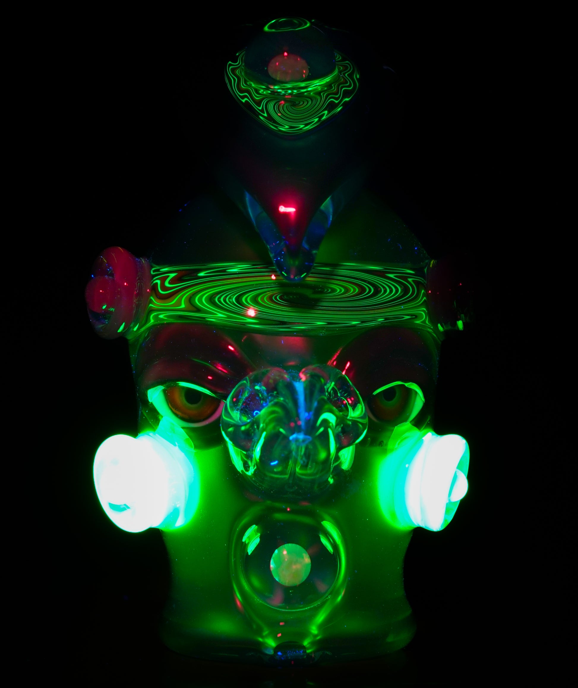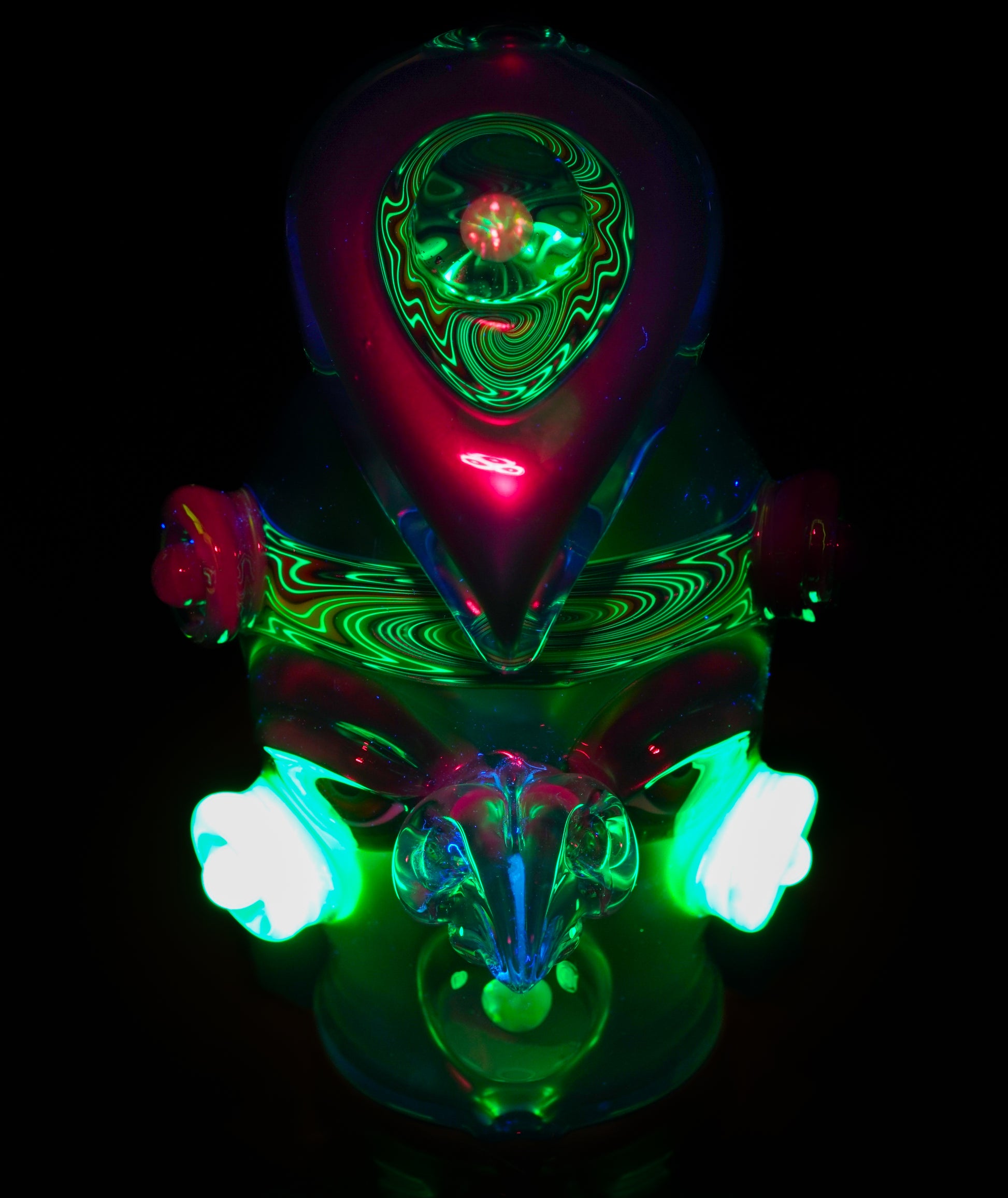 This electrum bird-head Peak top blends liquid-metal Electrum tones with a vibrant UV-reactive headband, wigwags on the third eye feather, and cheek accents. Opals shimmer subtly through the form, while the sculpted face gives it undeniable character