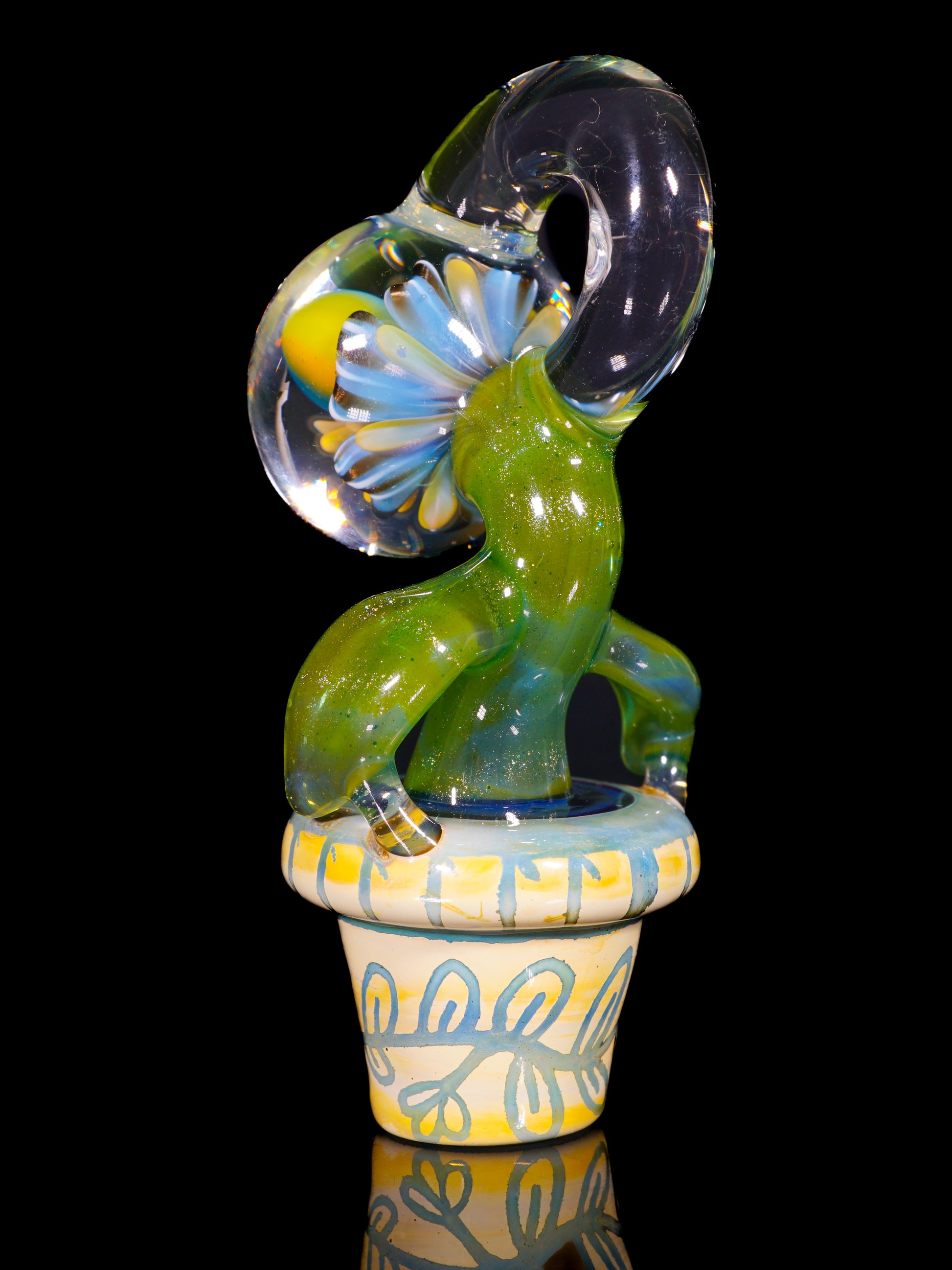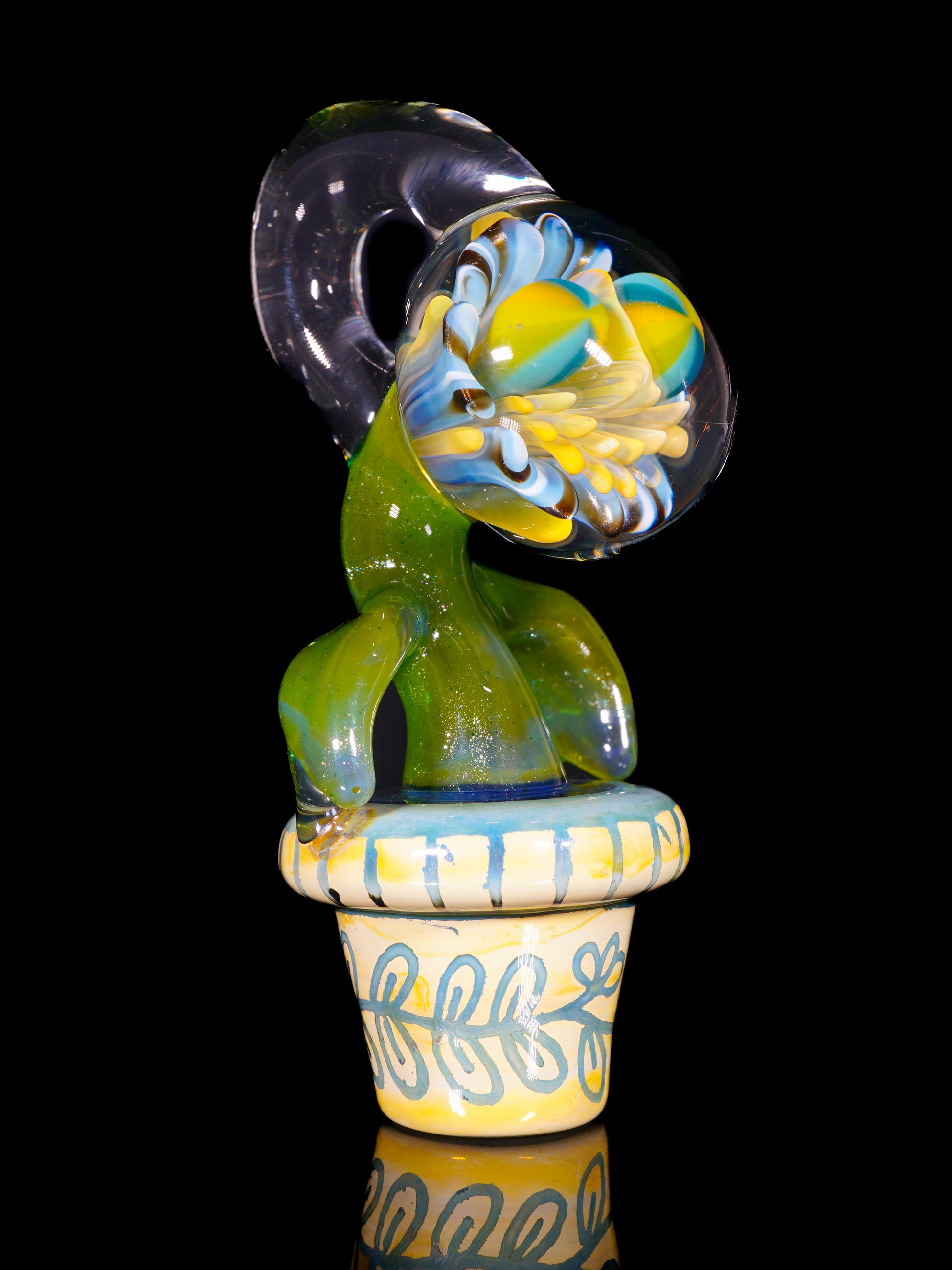 Whimsical flower pot pendant featuring a smiley face bloom, funky leaves and an etched pot.