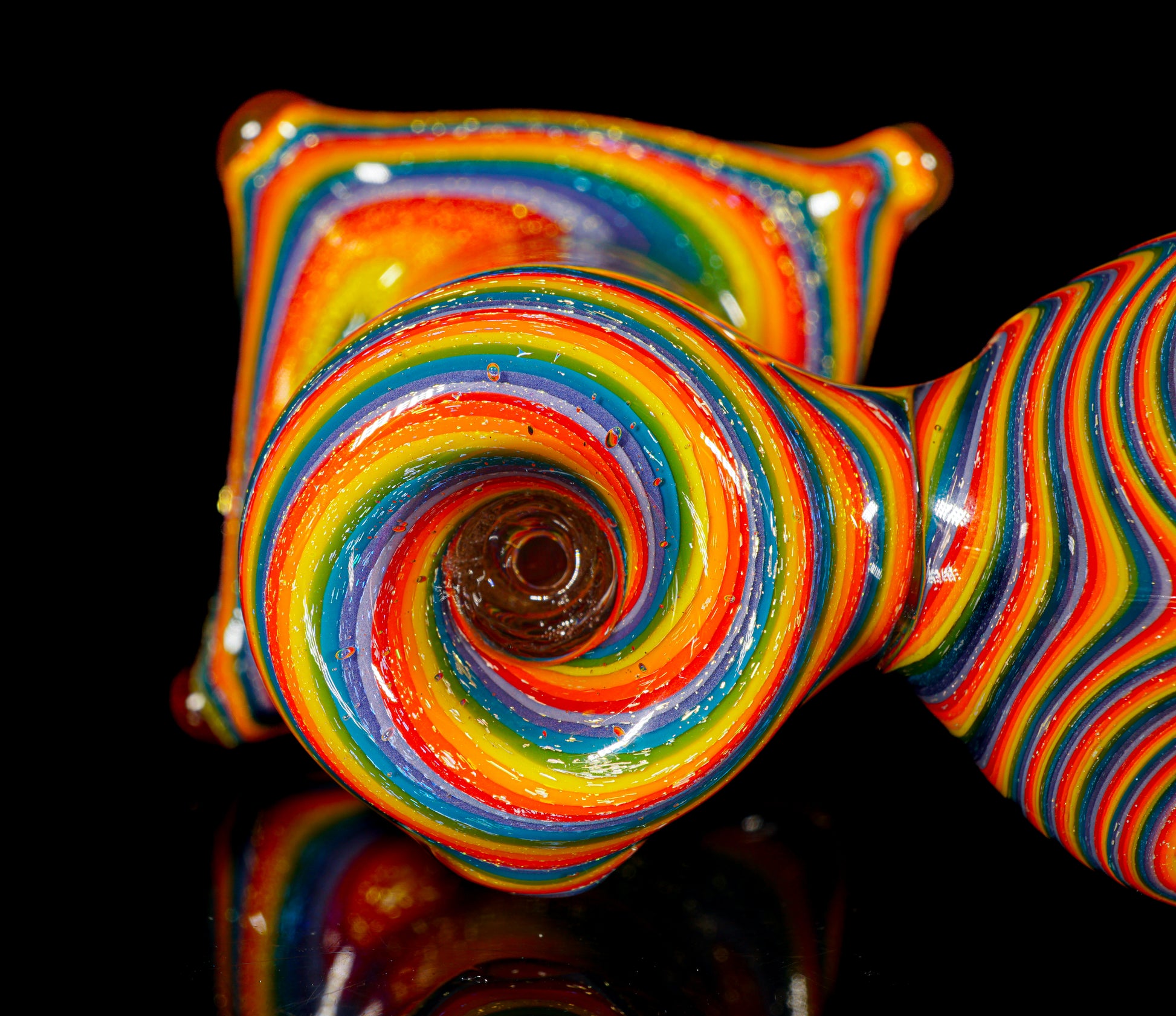 Flashy gold dichro coated rainbow wigwags cover every inch on this old school style hammer bubbler.