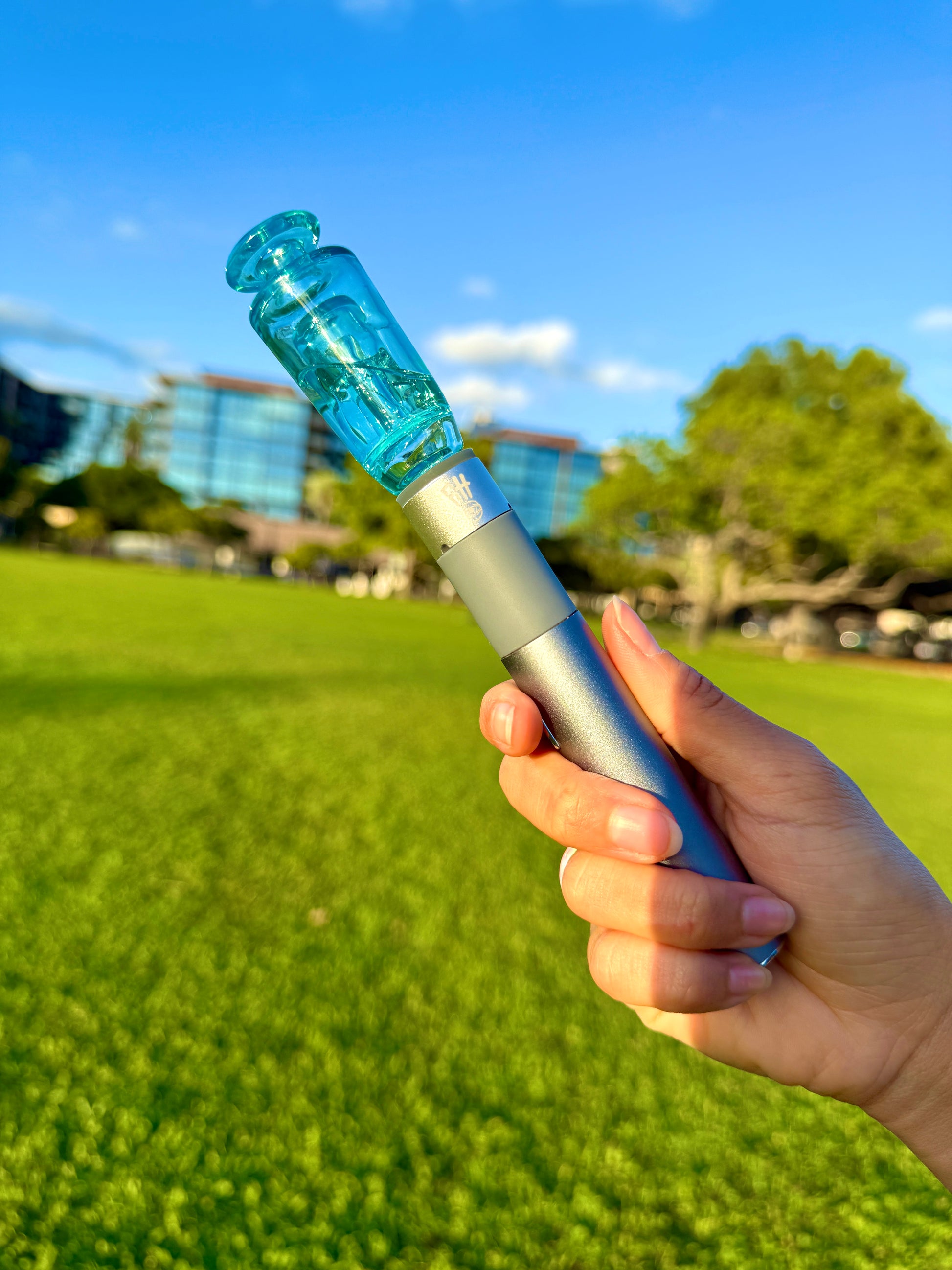 Bubbler tip for the Puffco Pivot made in Meta-Terrania; a bright sky blue.