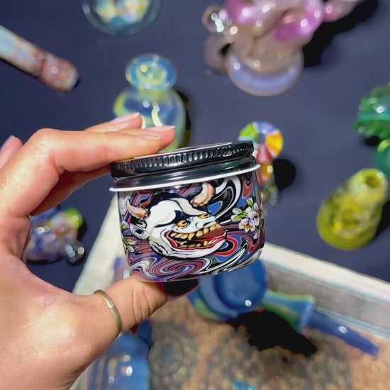Glass jar with threaded metal lid, featuring incredibly detailed murrine images: oni, monarch butterfly, sakura flowers and Boehme signature.
