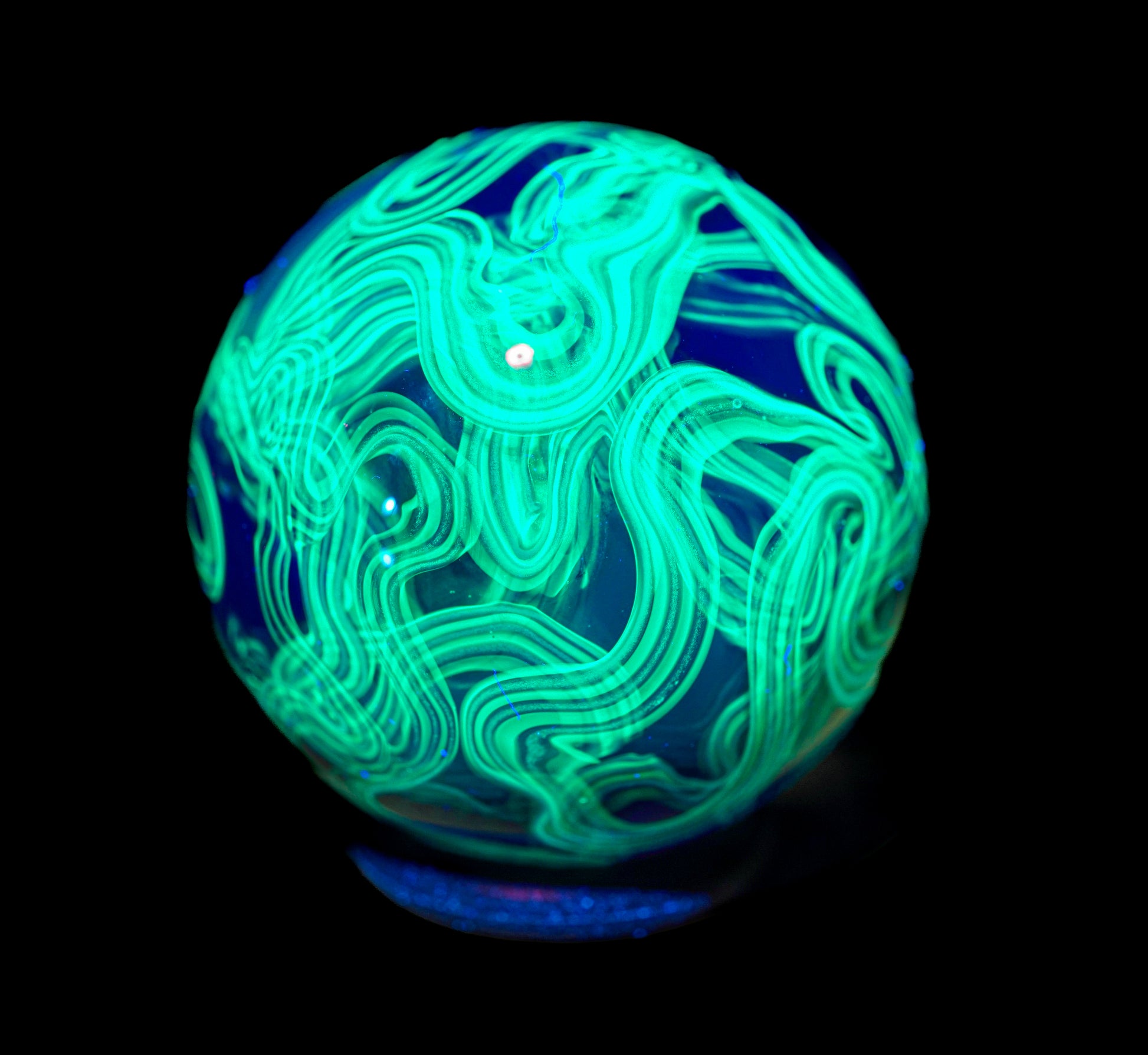 Neptunium based blue, green and purple marble with layers of uv-reactive scribbles throughout.