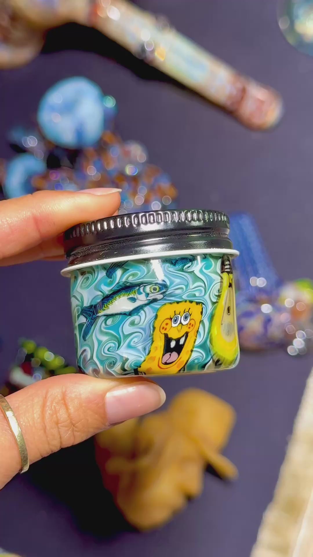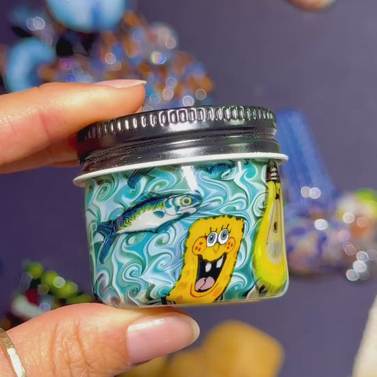 Glass jar with threaded metal lid, featuring incredibly detailed murrine images: SpongeBob, fish, lightbulb and angler!